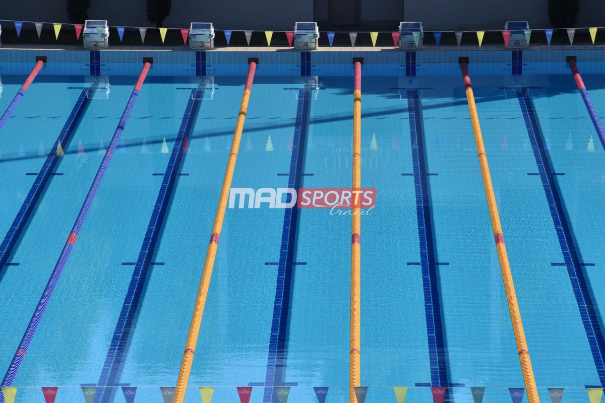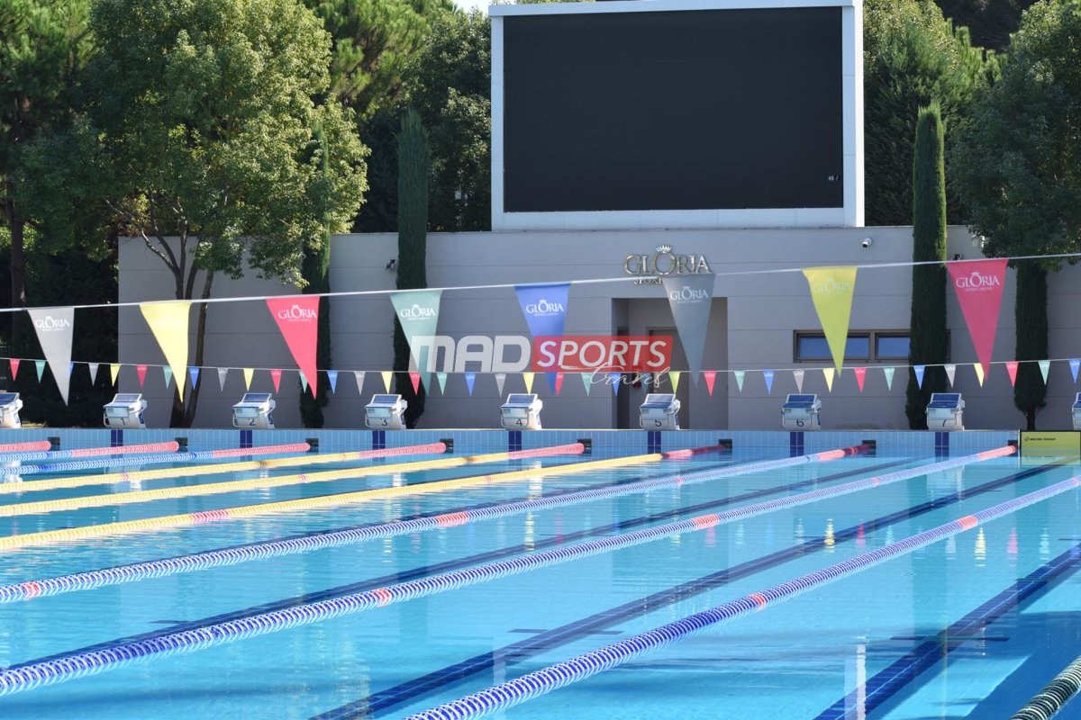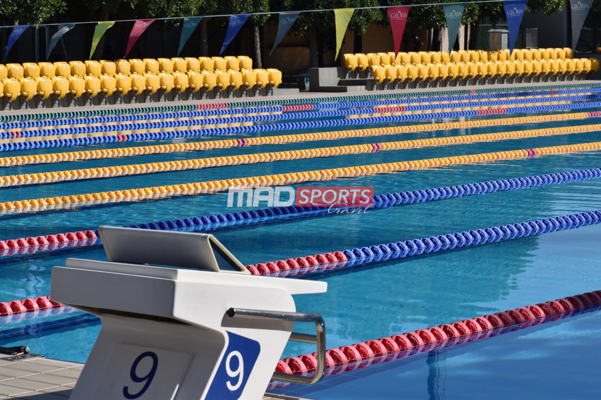 Открытый олимпийский бассейн с 10 дорожками, построенный в соответствии со стандартами FINA, оснащенный системами хронометража Omega и реле обнаружения поломки, измерением времени отклика и стартовыми блоками OSB11.